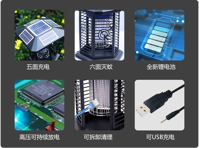 太陽(yáng)能庭院滅蚊燈,五面太陽(yáng)能板充電,也可以使用USB充電,是家用庭院滅蚊器,有掛鉤,既可以懸掛,也可以手提,便攜式可移動(dòng)。照明滅蚊兩用,物超所值。