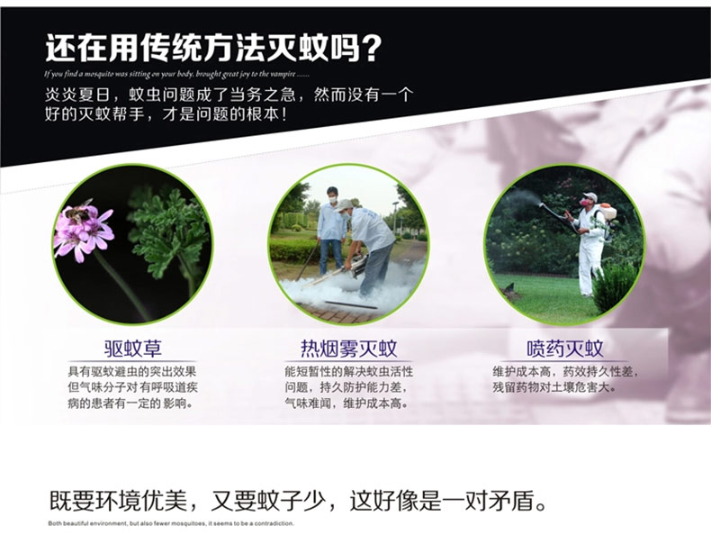 1、冷陰極燈管誘蚊效果,紫外線誘蚊,高壓電網(wǎng)殺蚊,物理方式滅蚊,環(huán)保無污染。
